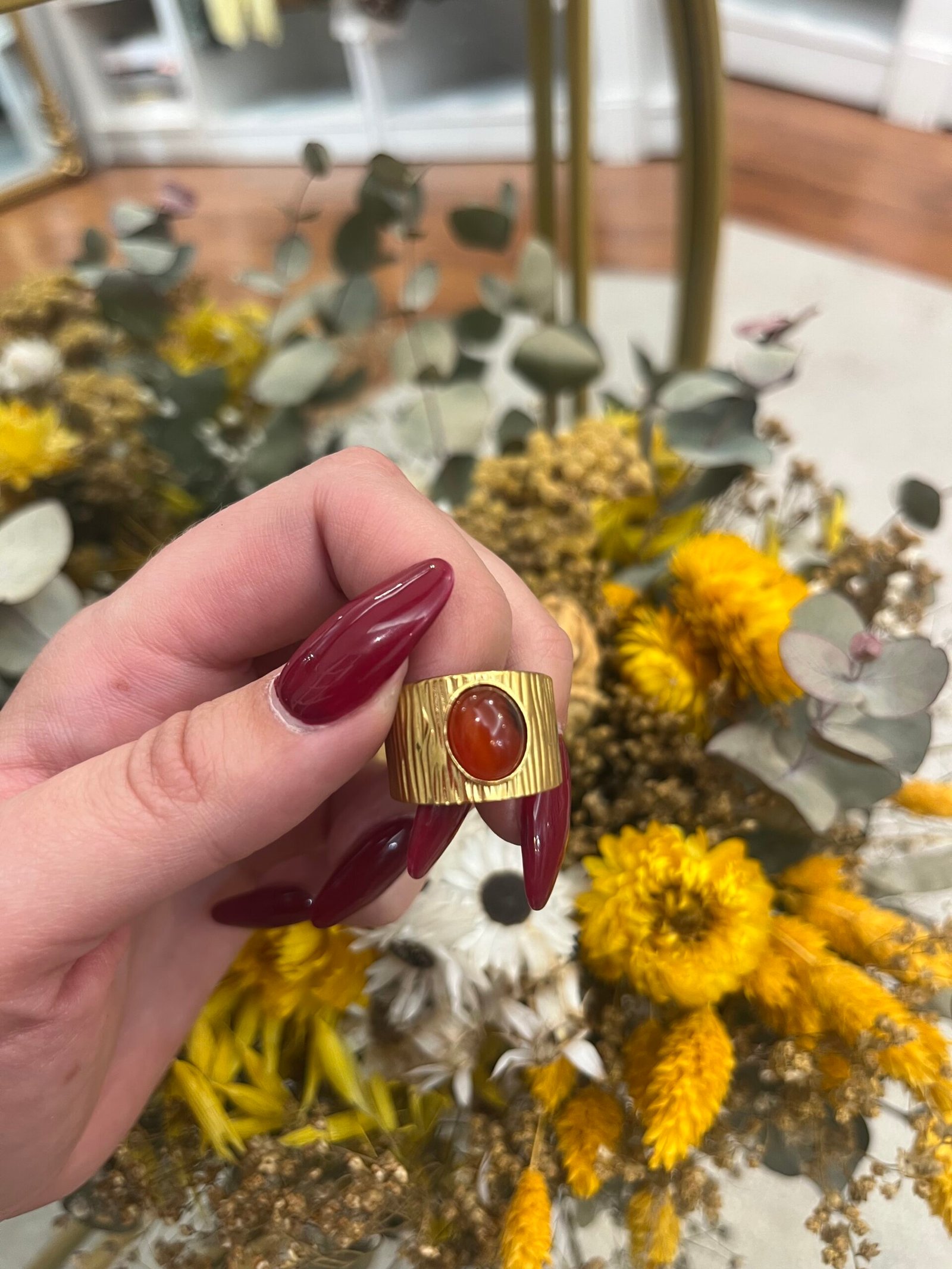 Anillo ajustable de acero inoxidable dorado con piedra central en tono ámbar que aporta calidez y elegancia. Su diseño ancho y textura grabada realzan la mano con carácter y sofisticación. Mantiene su brillo con el paso del tiempo.