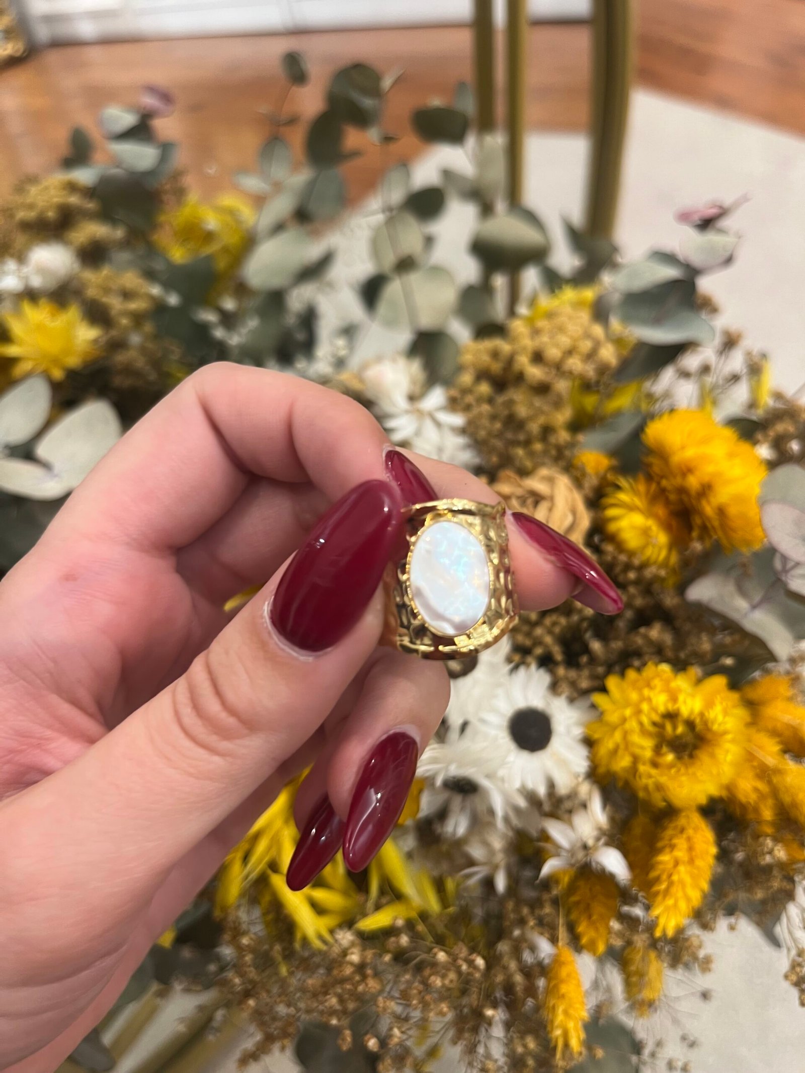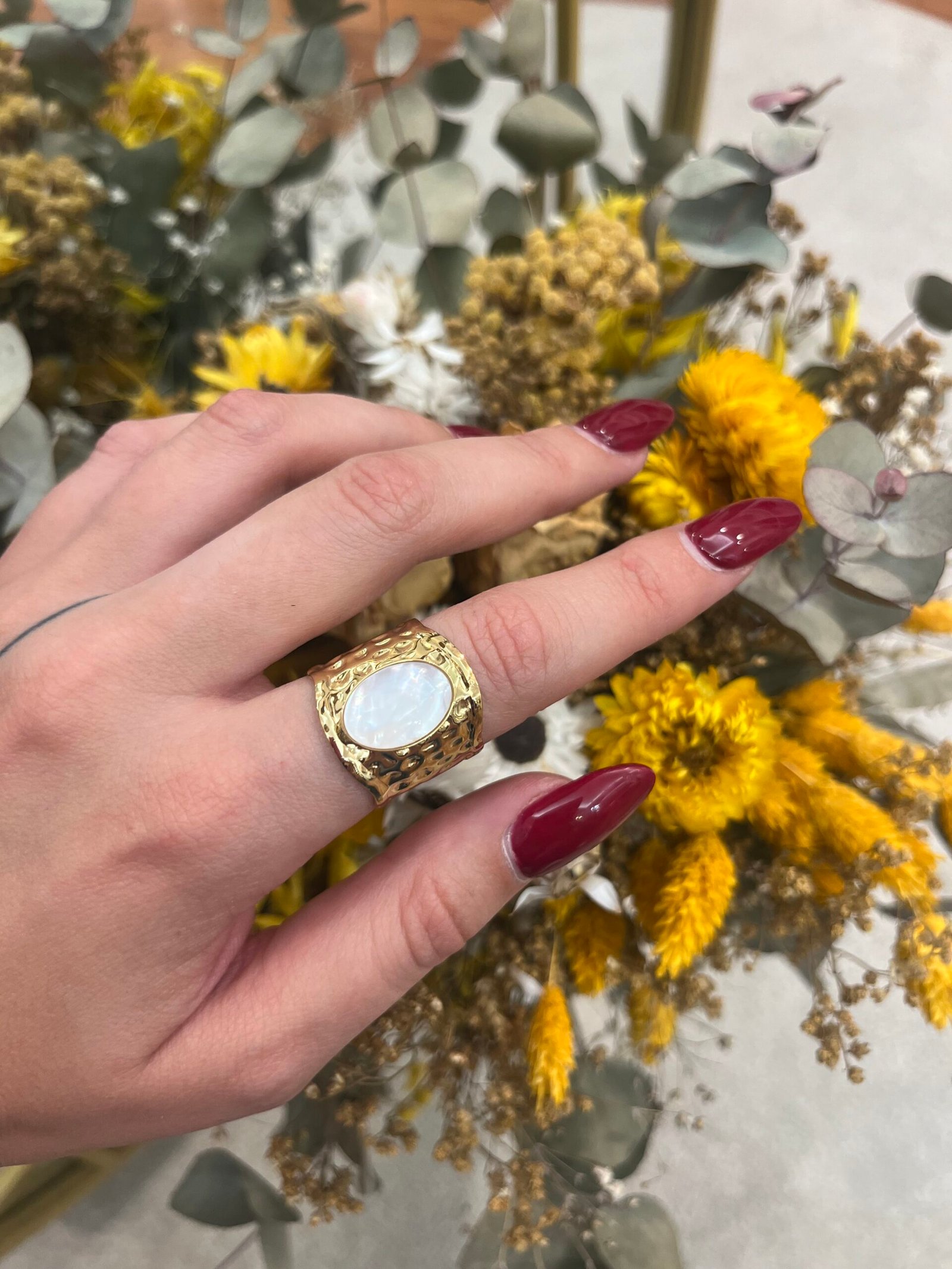 Anillo ajustable de acero inoxidable dorado con piedra central en tono nácar, que refleja la luz con un brillo suave y natural. Inspirado en la calma del mar y la elegancia mediterránea, con un brillo que perdura.