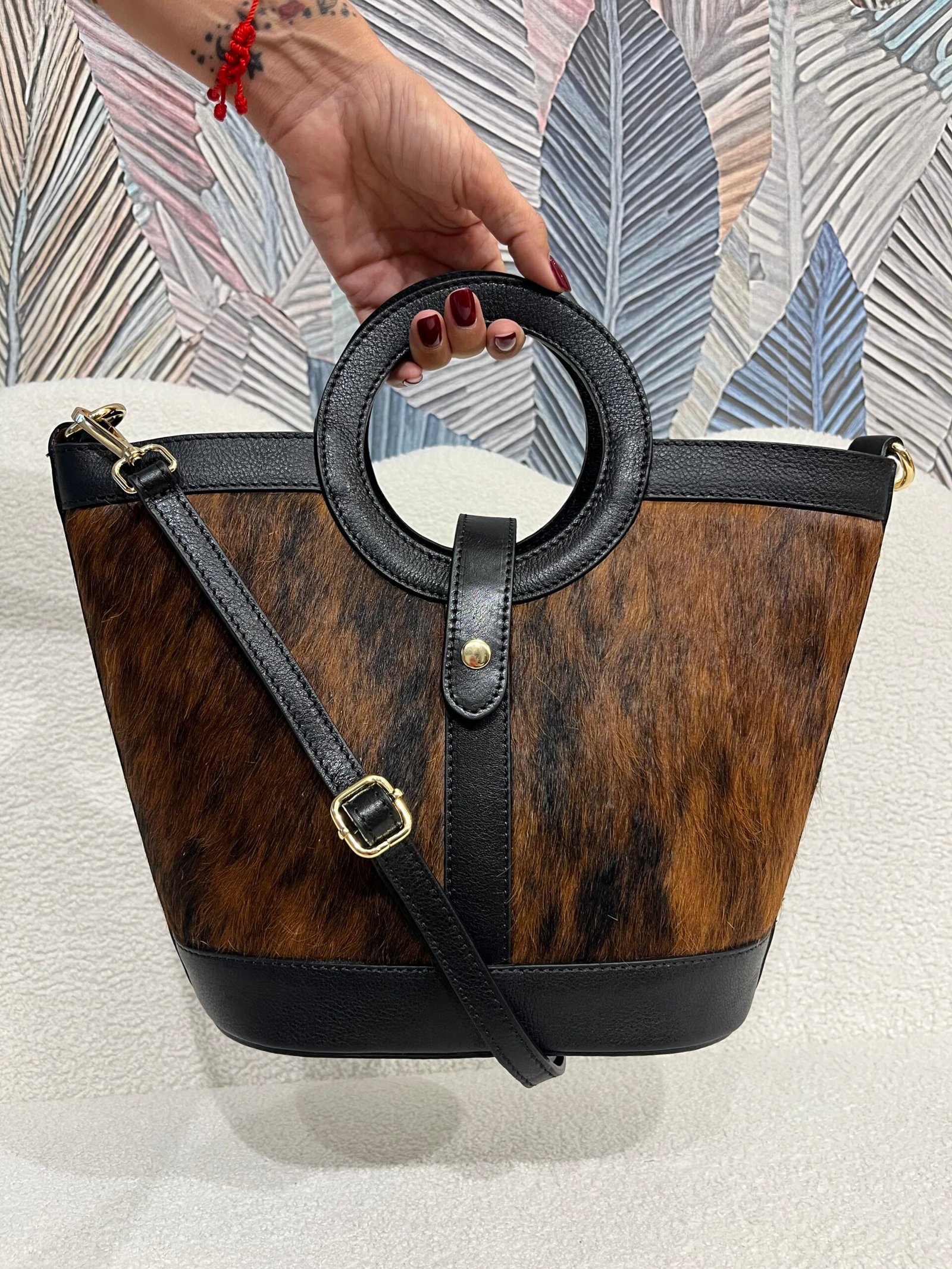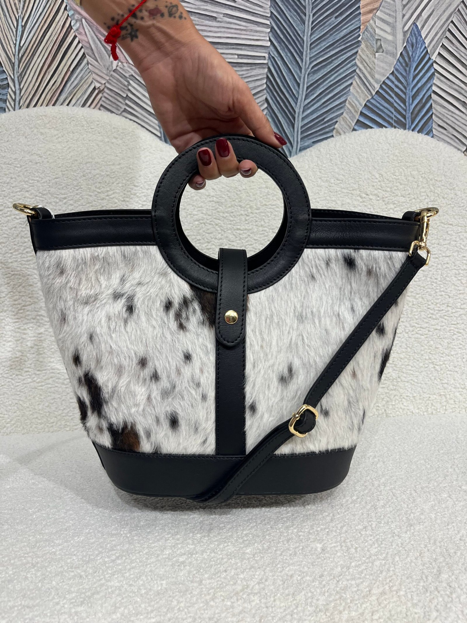 Bolso de piel con textura de pelo. Su original asa circular rígida aporta un toque distintivo y elegante, mientras que la correa larga regulable permite llevarlo también al hombro o cruzado. Disponible en color marrón carey y blanco moteado, dos versiones con carácter y estilo propio.