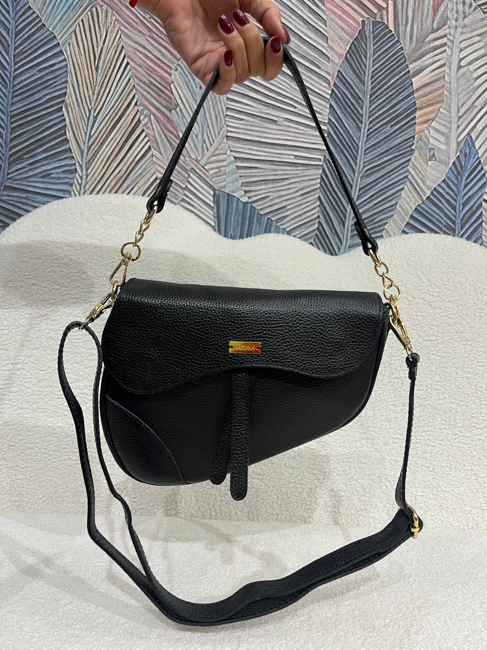 Bolso de piel con diseño tipo saddle de líneas suaves y estructura flexible. Dispone de doble correa: una corta para llevar al hombro y otra larga regulable para estilo bandolera. Detalles dorados y cierre con solapa que aportan un toque de elegancia y funcionalidad. Disponible en color negro y verde oliva.