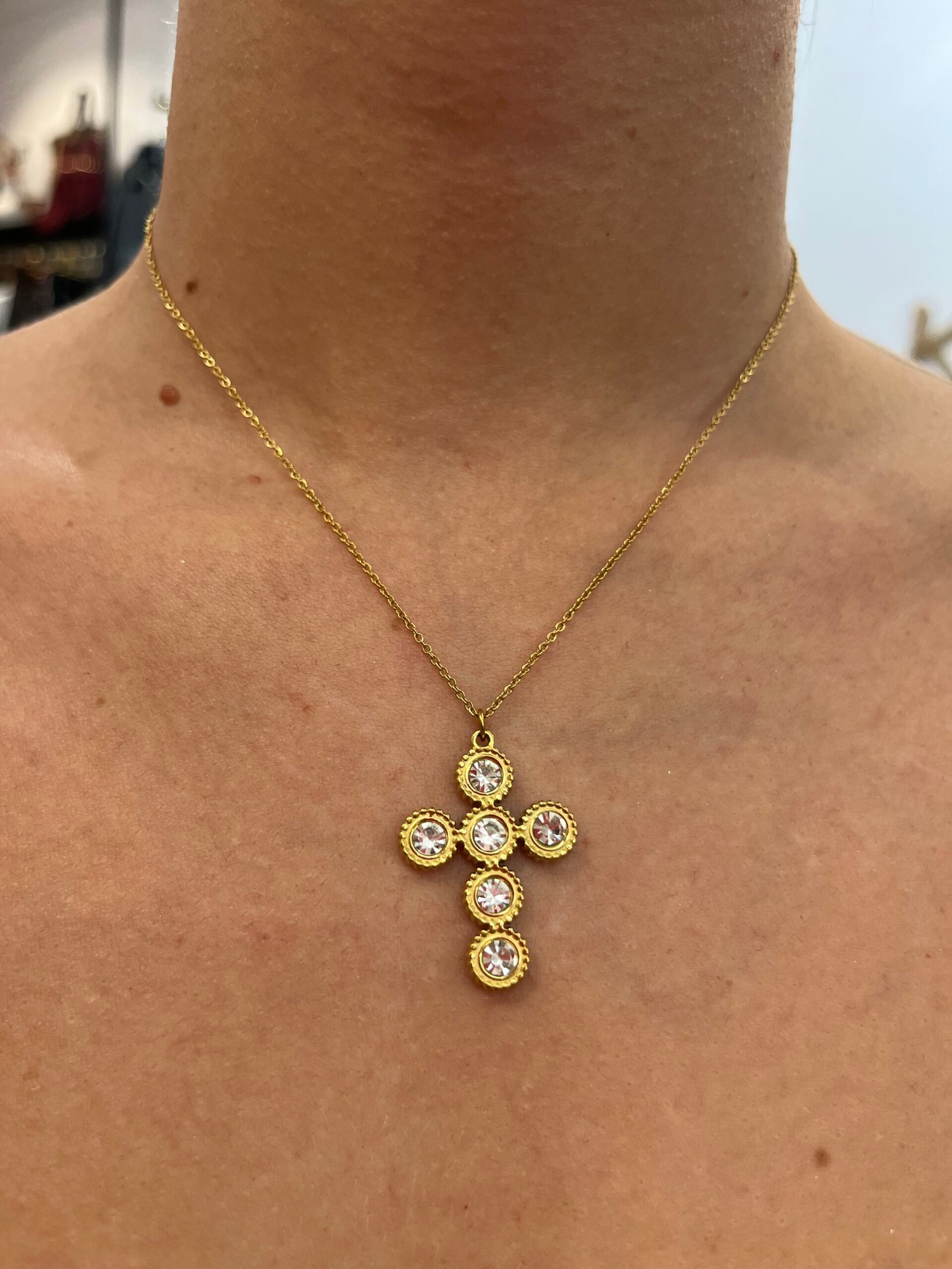 Colgante de acero inoxidable dorado con delicadas piedras brillantes que aportan luz y sutileza. Una pieza elegante y femenina, ideal para añadir un toque romántico y especial a cualquier look.