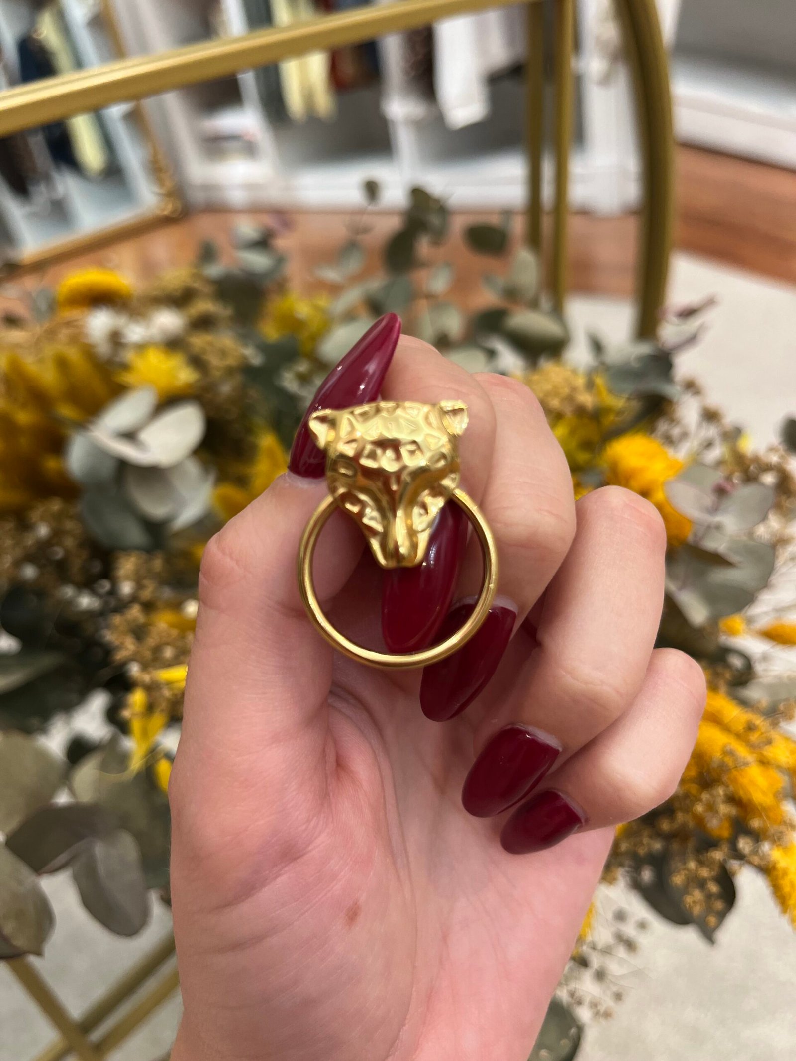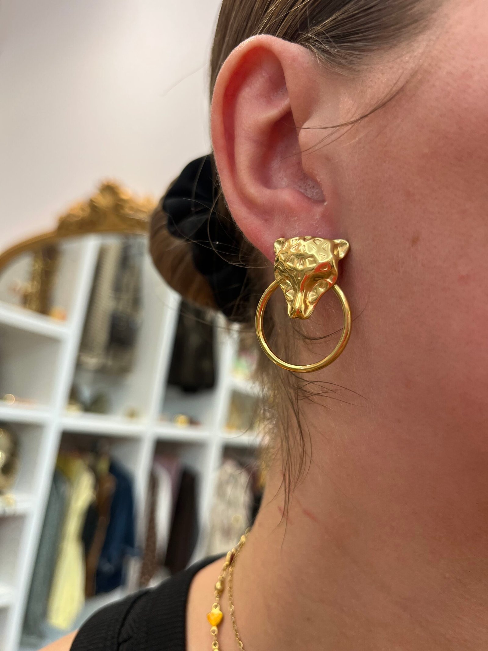 Pendientes de acero inoxidable dorado con diseño de cabeza felina y aro colgante. Una pieza con personalidad y elegancia que combina estilo y fuerza en cada detalle.