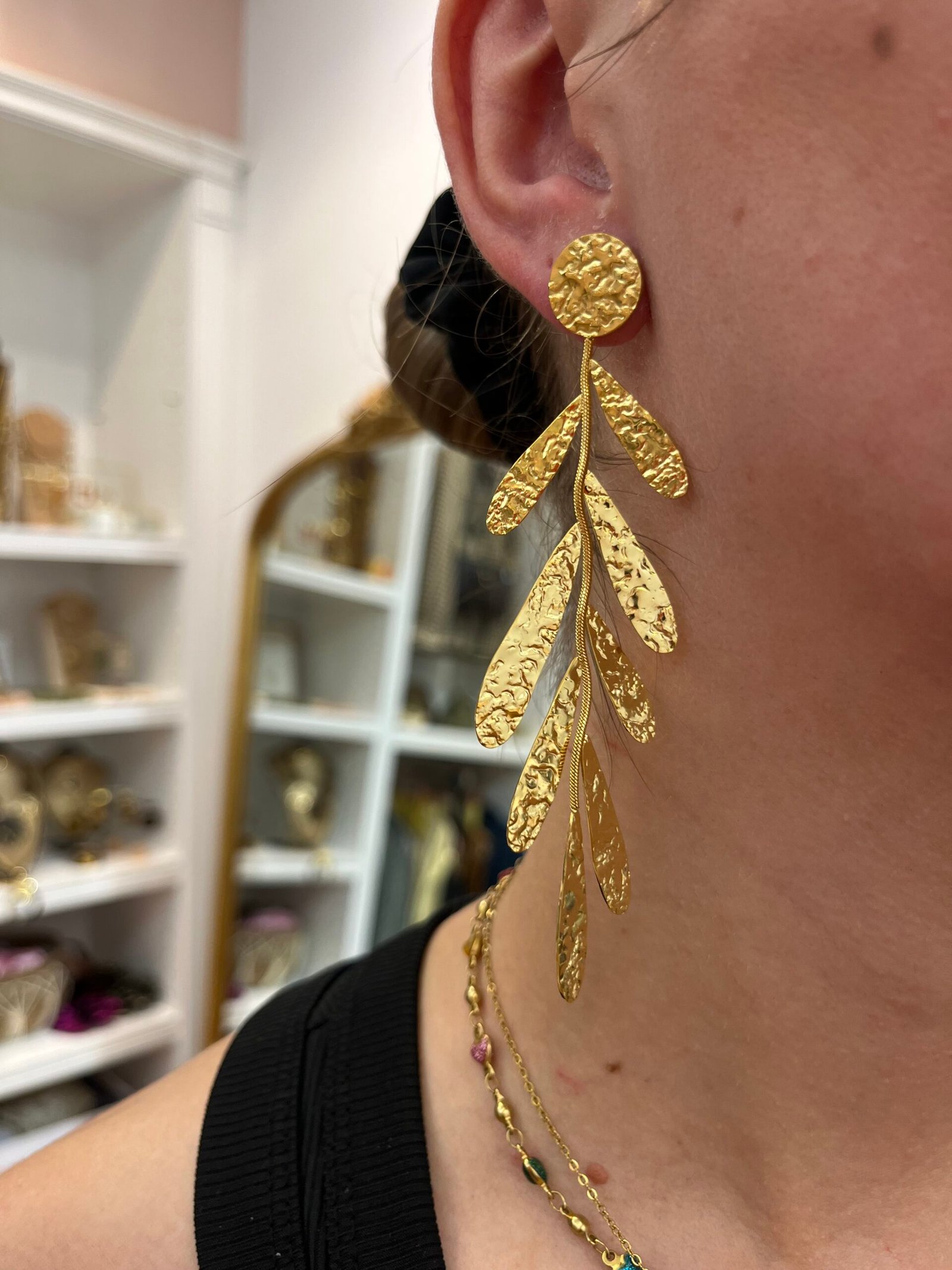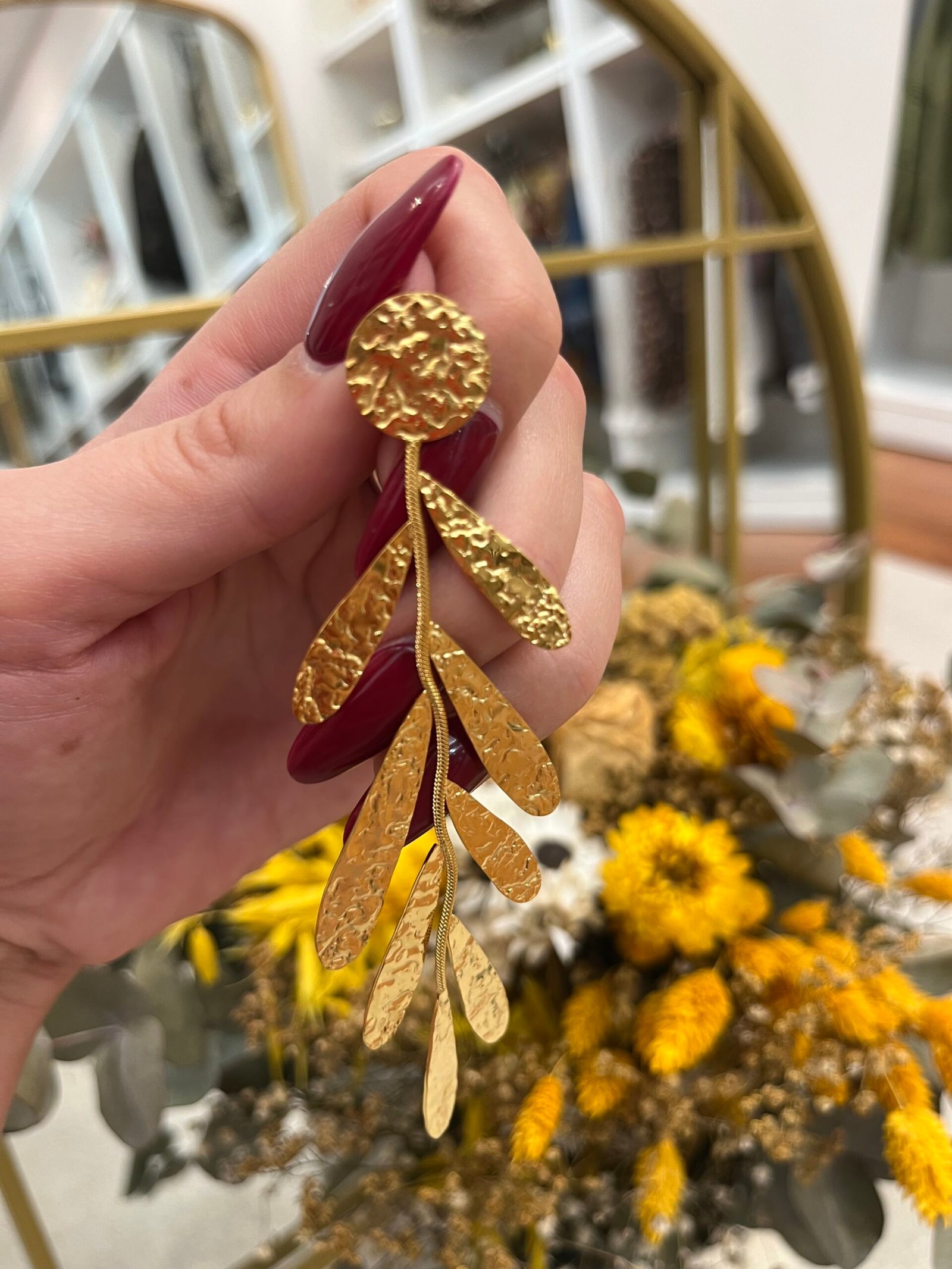 Pendientes de acero inoxidable dorado con diseño de hojas martilladas que evocan la elegancia del antiguo Egipto. Una pieza ligera y llamativa que aporta movimiento y distinción a cualquier look.