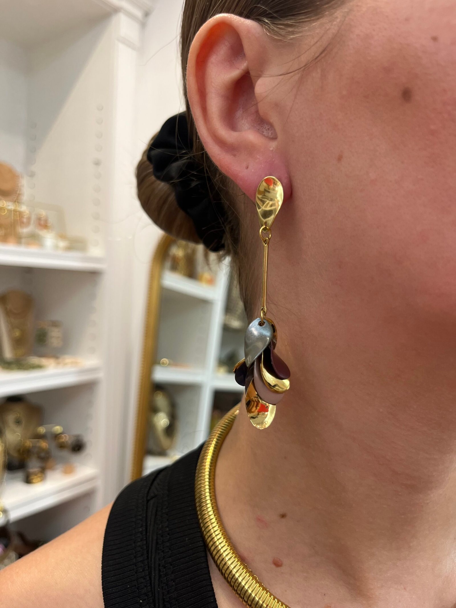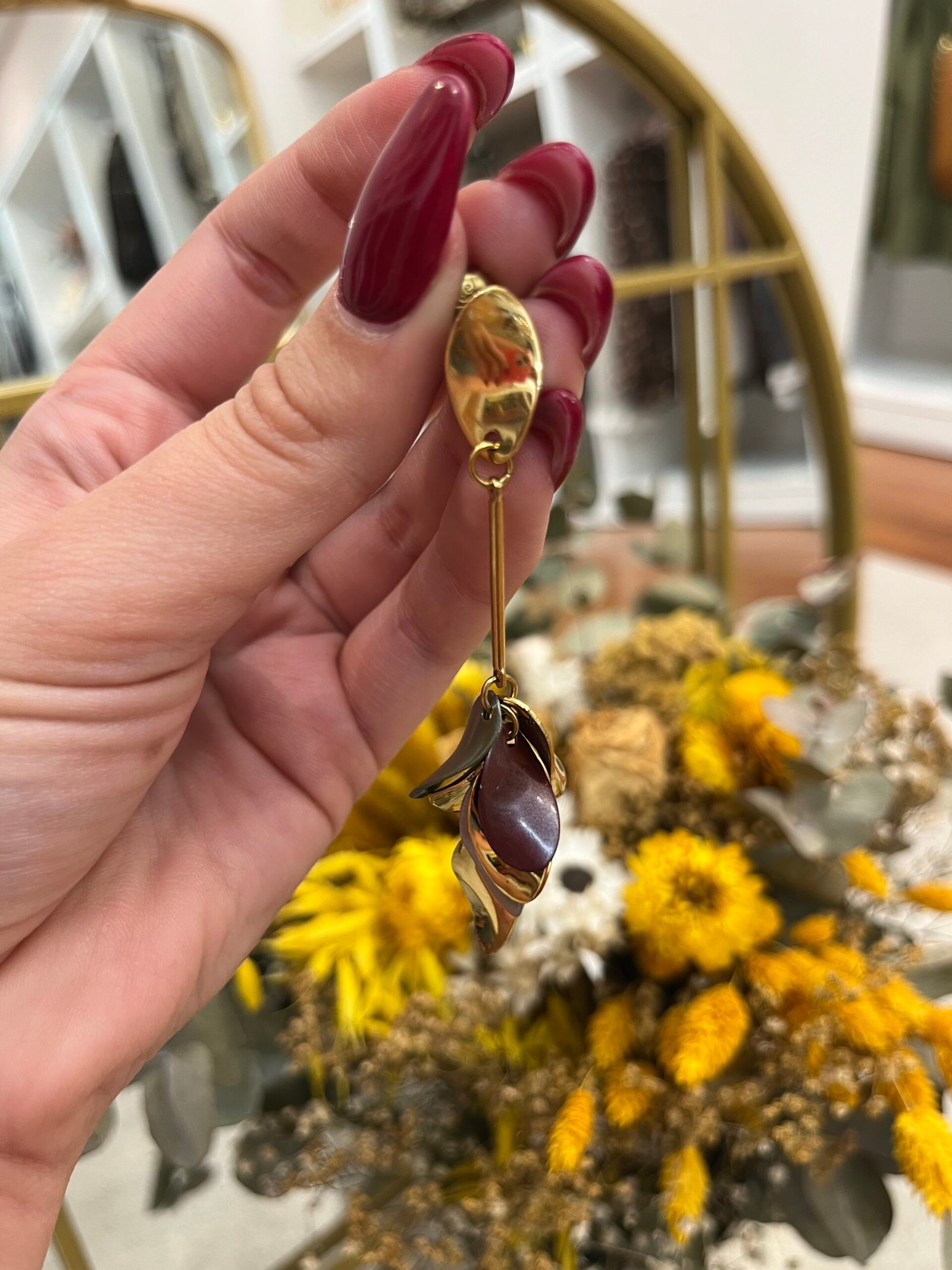 Pendientes largos de acero con acabado dorado y diseño en forma de hojas superpuestas en tonos oro y burdeos. Su movimiento y brillo los convierten en una pieza llamativa y elegante, ideal para dar un toque distintivo a cualquier conjunto.