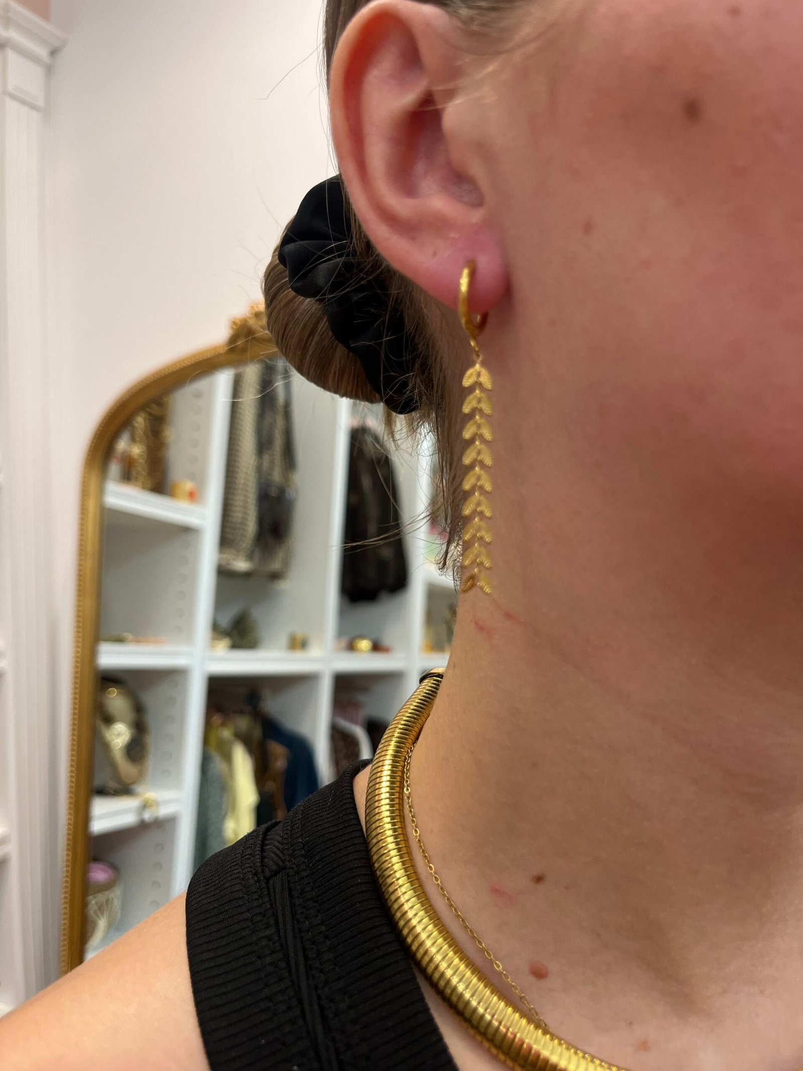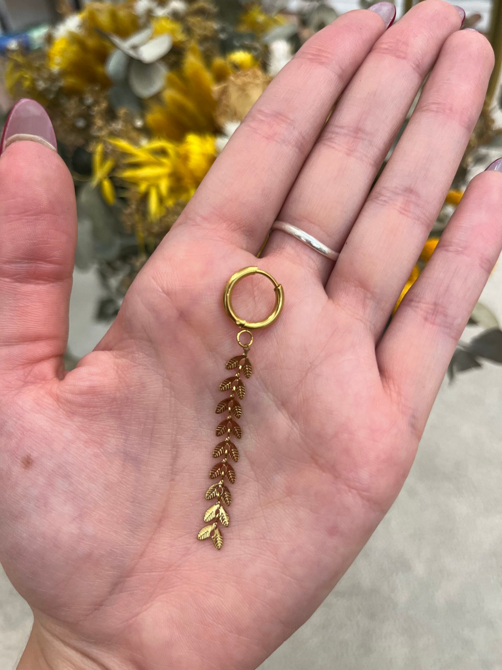 Pendientes de acero con diseño de hojas doradas en cascada. Su forma alargada realza el rostro y aporta un toque elegante y luminoso a cualquier look. Ligeros y cómodos de llevar, ideales tanto para el día como para la noche.