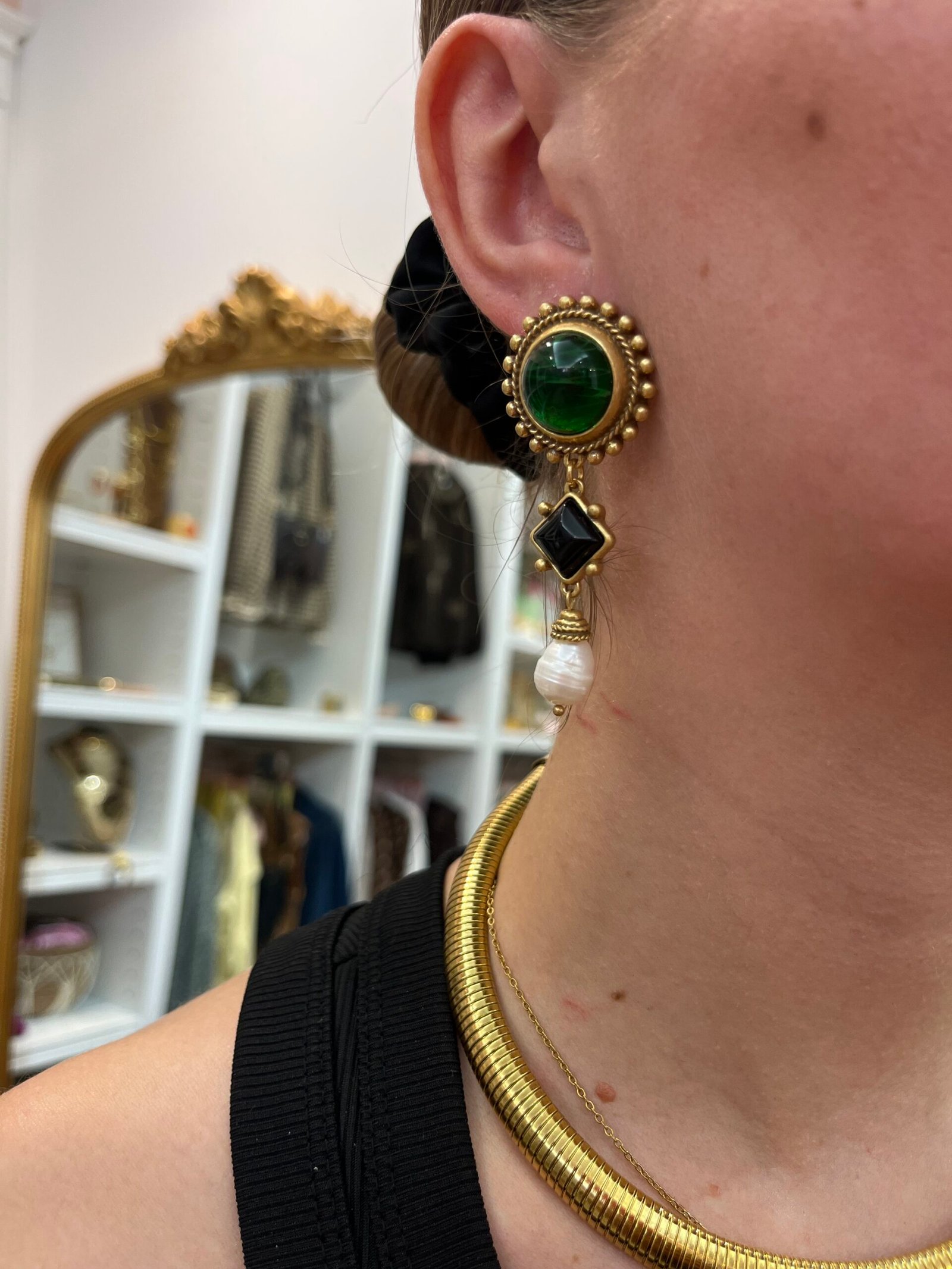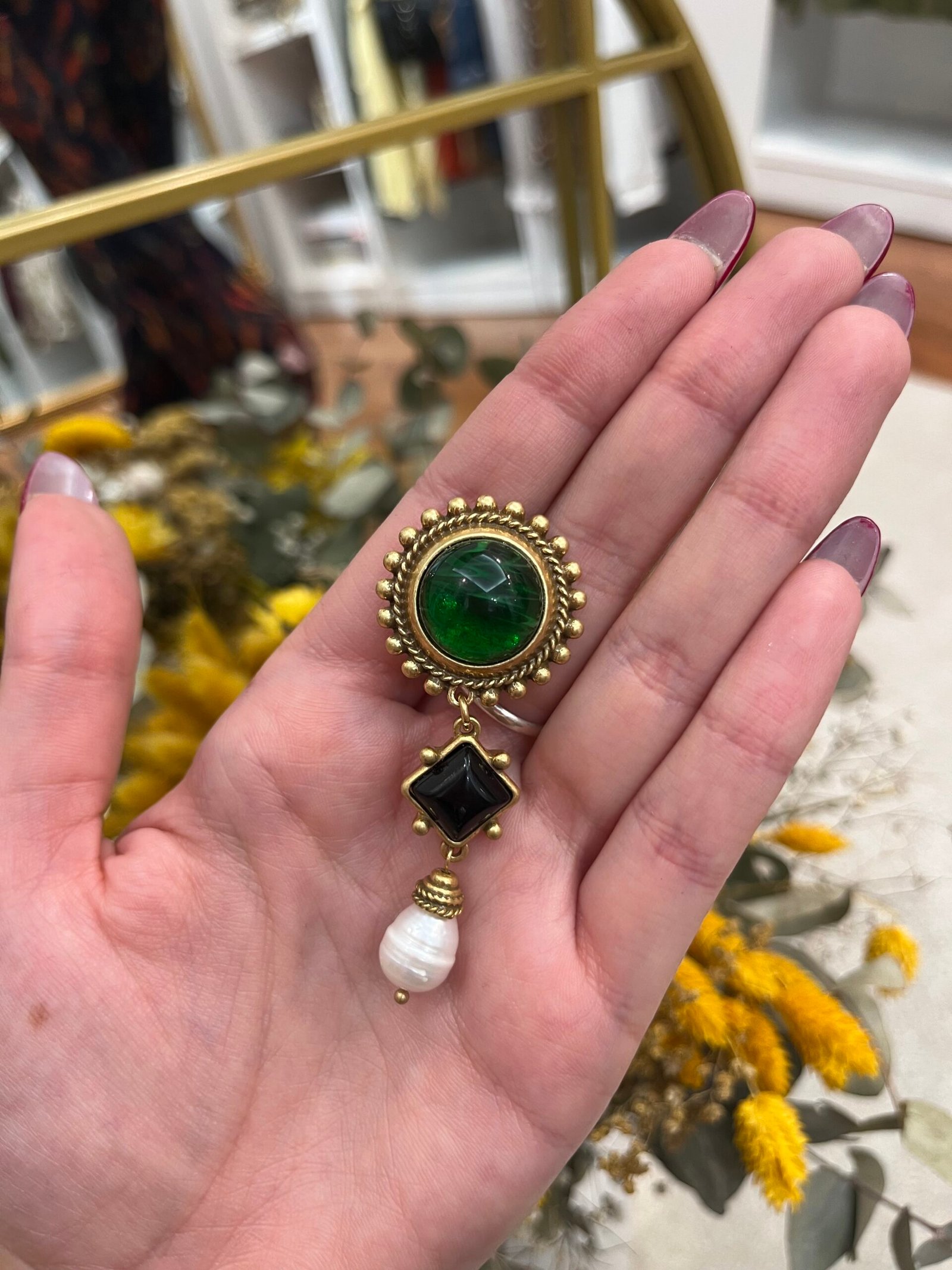 Pendientes de acero con diseño artístico compuesto por una piedra verde central, detalle geométrico negro y colgante de perla blanca. Una pieza elegante y sofisticada con inspiración vintage, perfecta para elevar cualquier look.