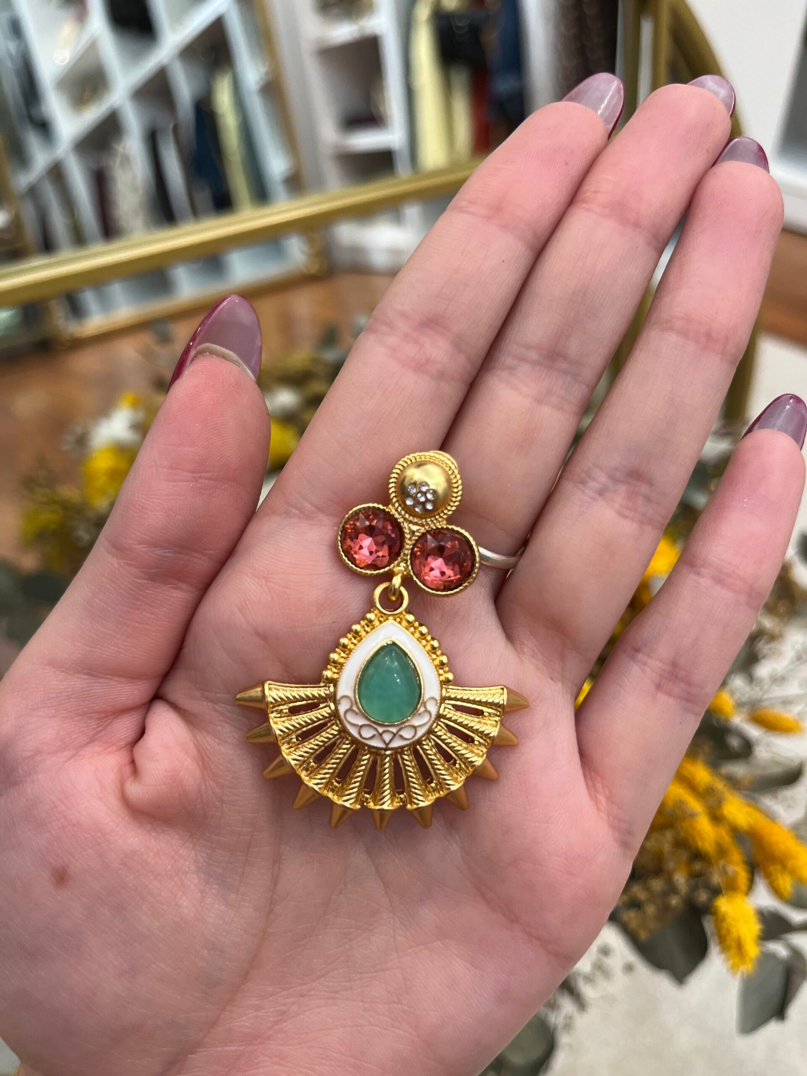 Pendientes de acero dorado con diseño artístico que combina piedras en tonos verde jade y rosa coral. Su forma geométrica con detalle en abanico aporta un aire elegante y sofisticado, perfecto para realzar cualquier look.