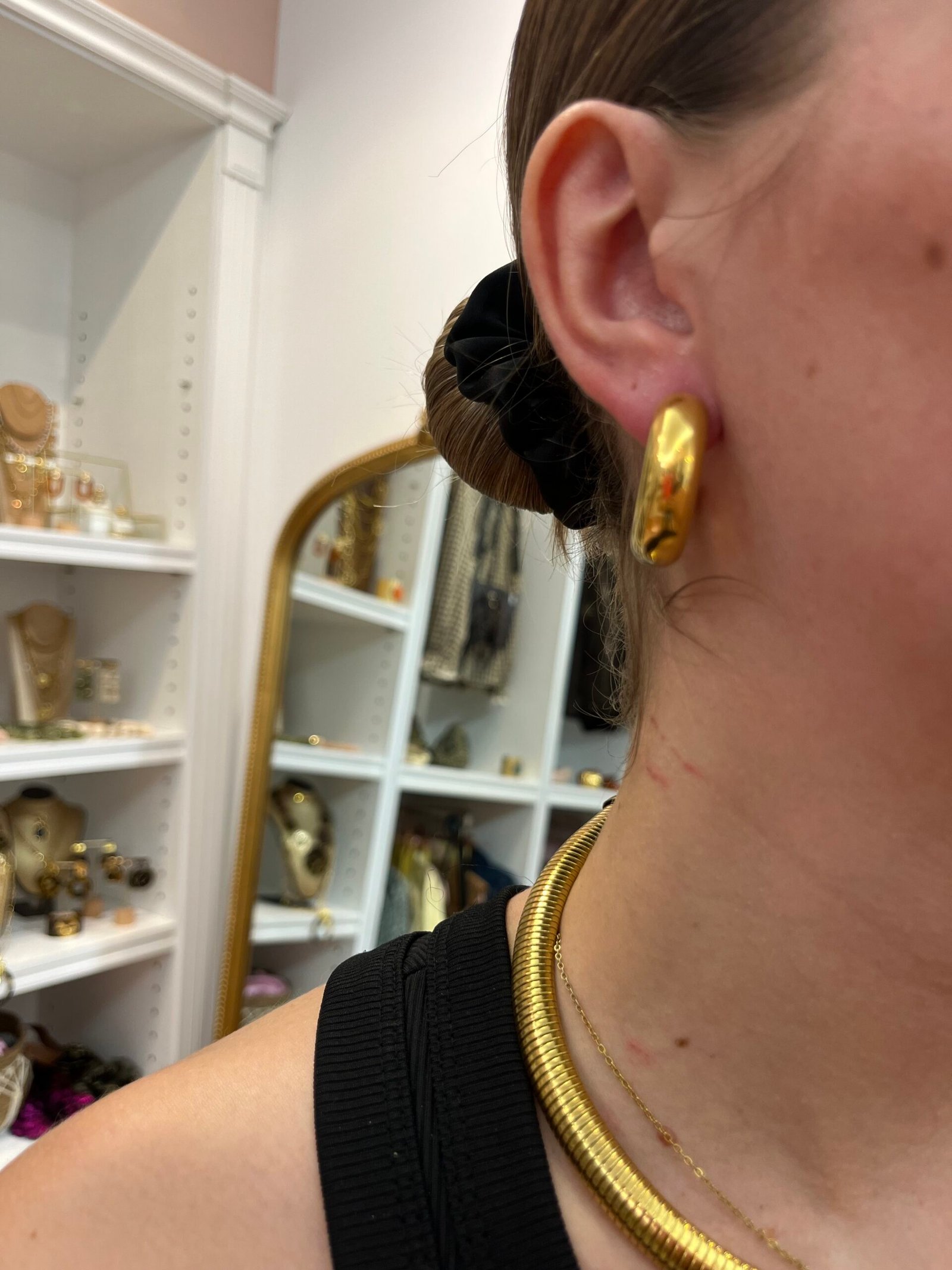 Pendientes de aro grueso en acero con acabado dorado pulido. Su diseño abombado y brillante aporta un aire moderno y sofisticado, perfecto para elevar cualquier look con un toque de elegancia atemporal.