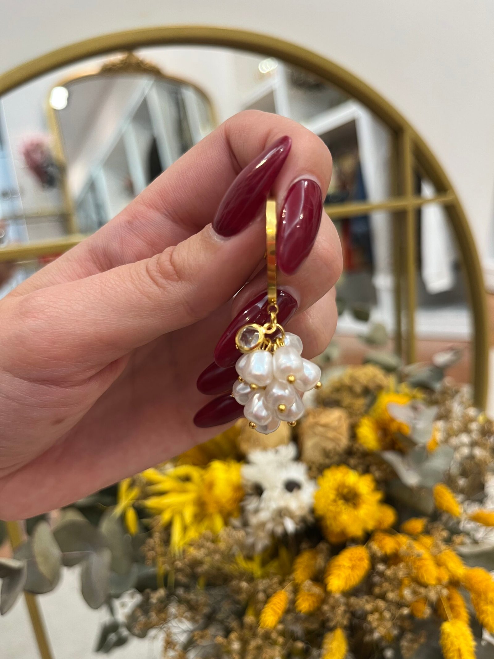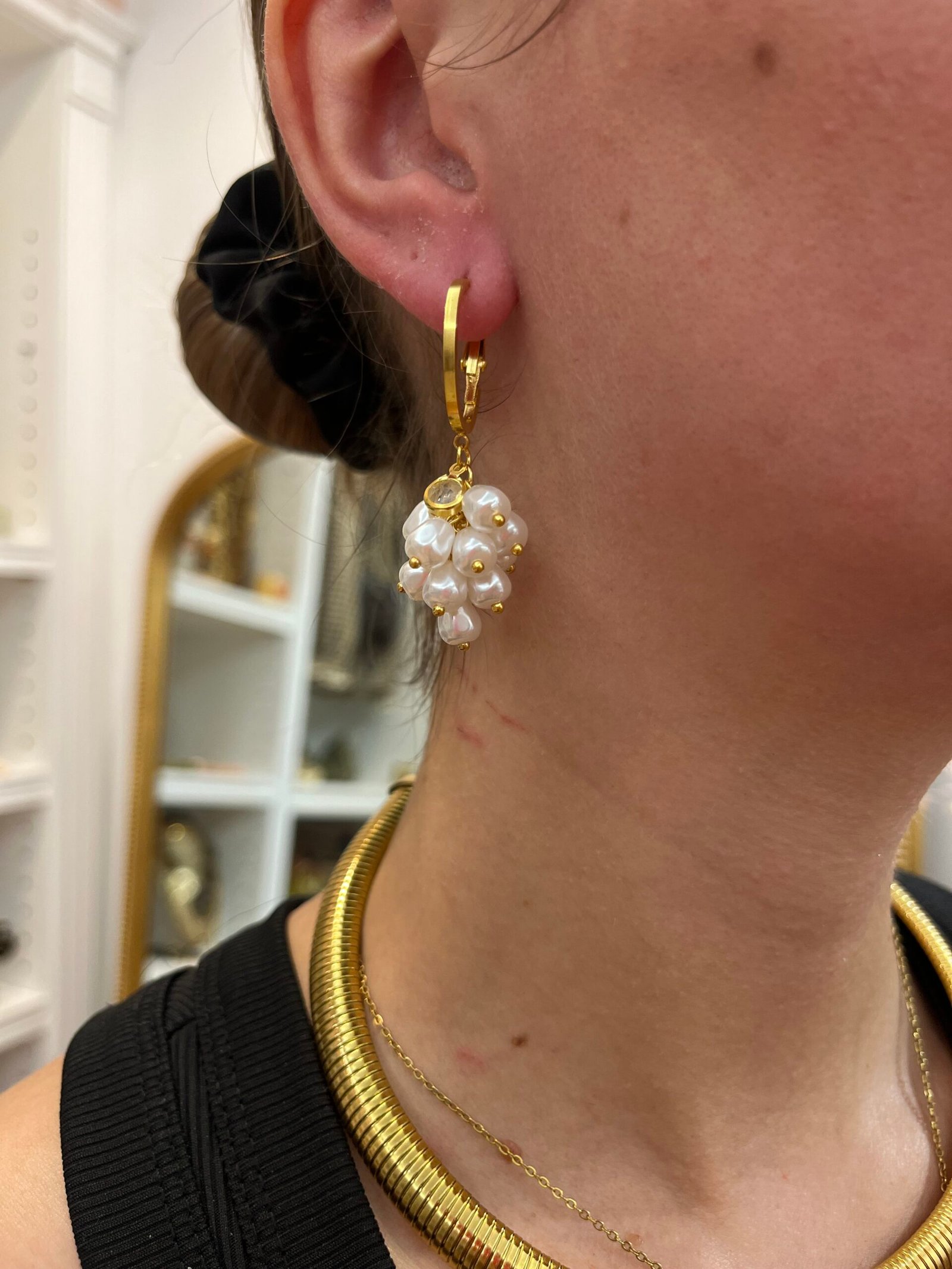 Pendientes de acero dorado con colgante de perlas irregulares formando un racimo. Su diseño elegante y original aporta un toque fresco y sofisticado, ideal para combinar con looks tanto formales como casuales.