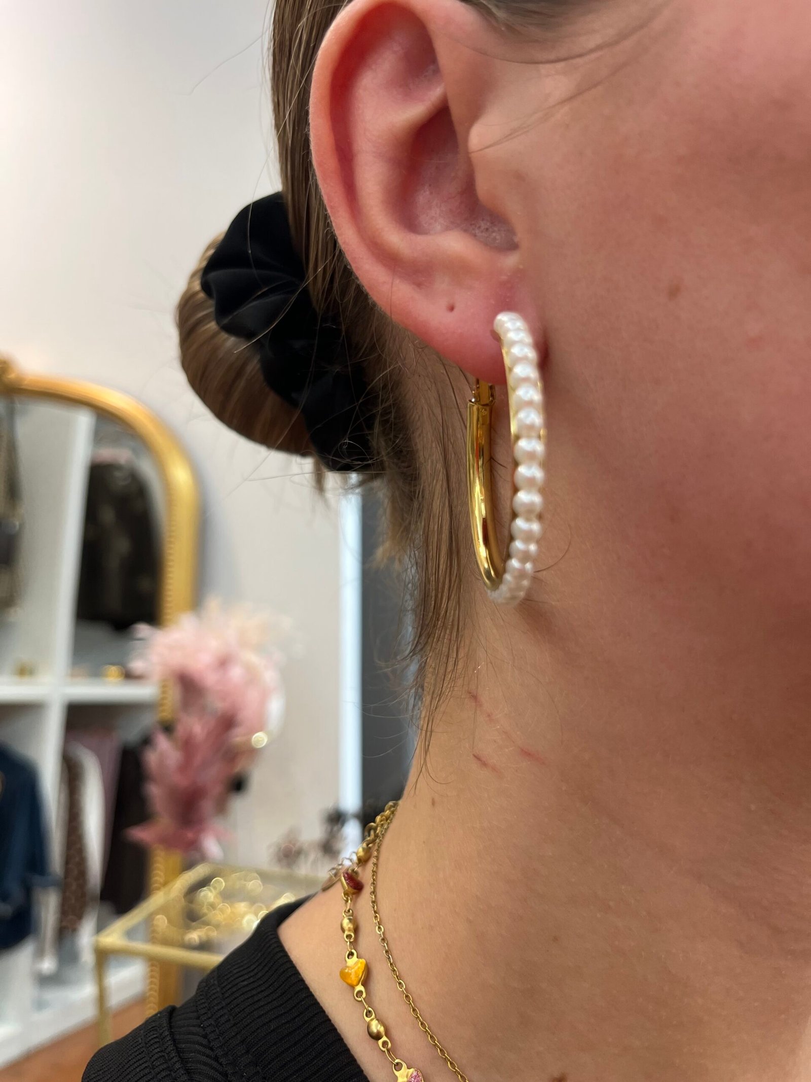 Aros de acero inoxidable dorado decorados con delicadas perlas, una combinación perfecta de elegancia y estilo atemporal. Ideales para elevar cualquier look con un toque de sutileza.