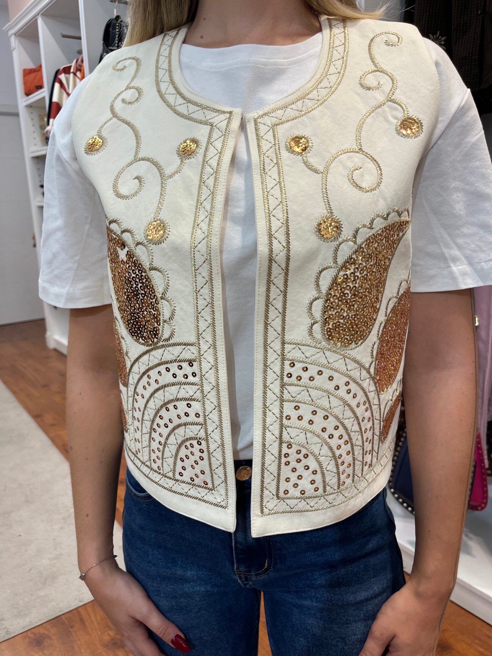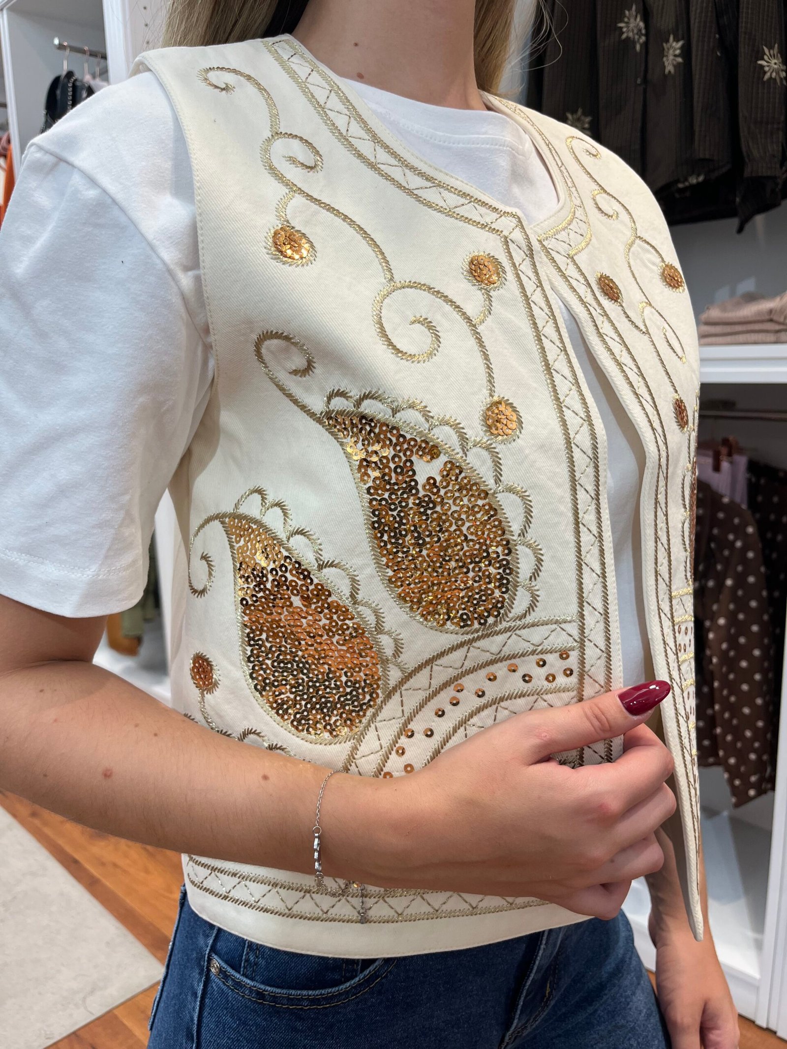 Chaleco en tono beige crudo, con bordados en hilo dorado y aplicaciones de lentejuelas que crean un diseño artesanal y luminoso.