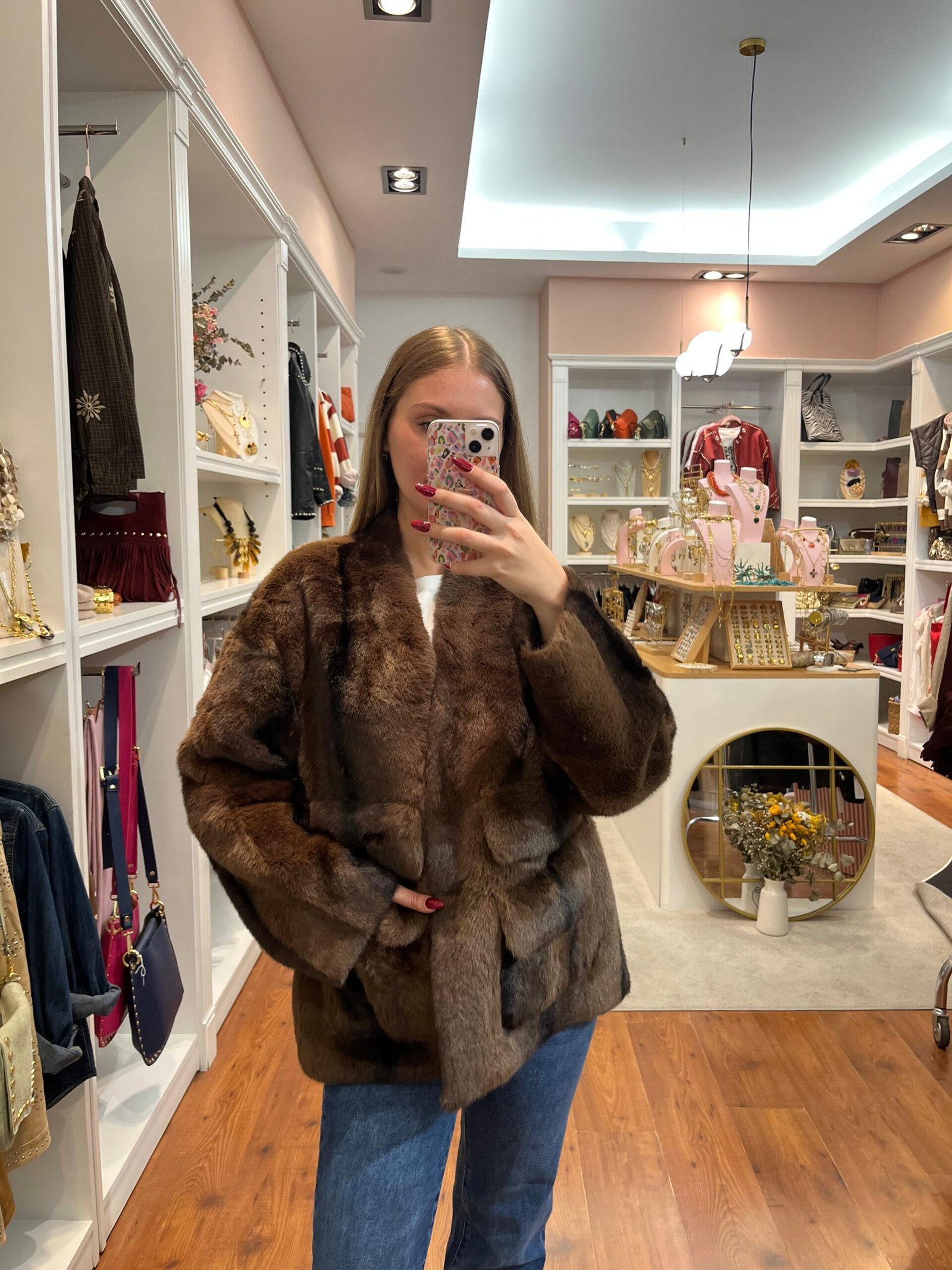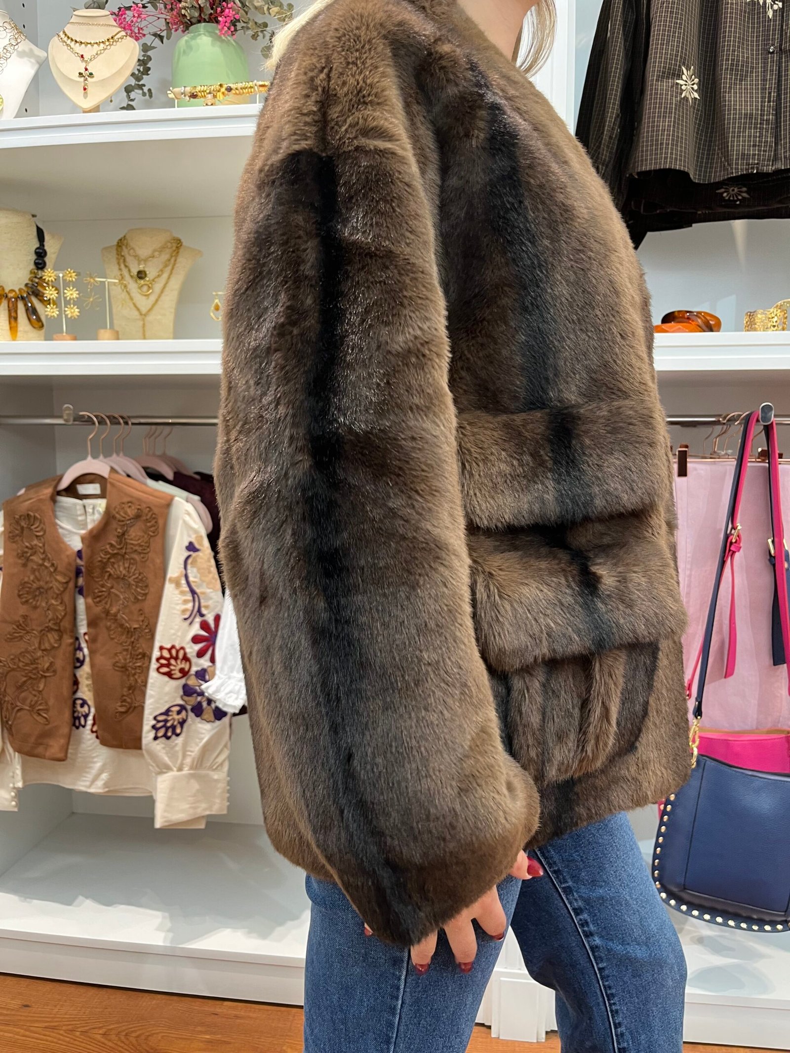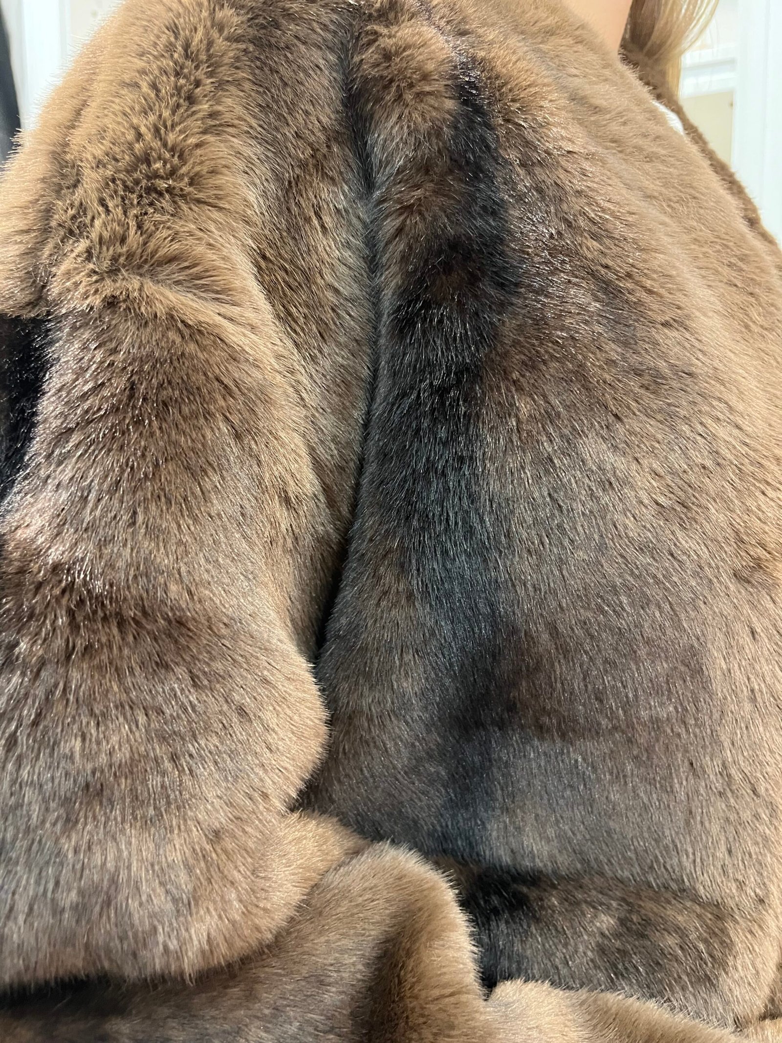 Abrigo confeccionado en pelo sintético de tacto sedoso, con un delicado acabado en tonos marrón chocolate degradado.
