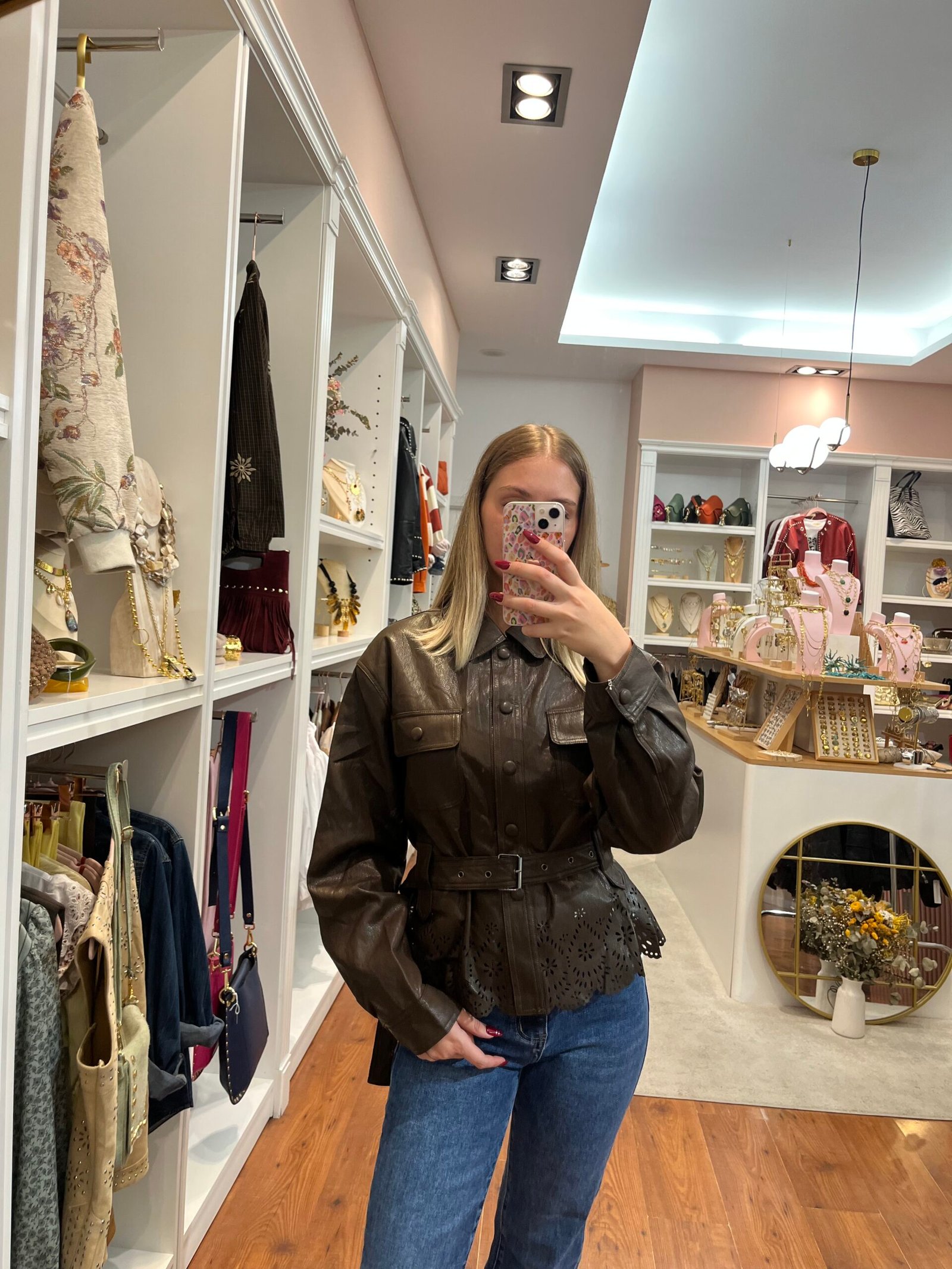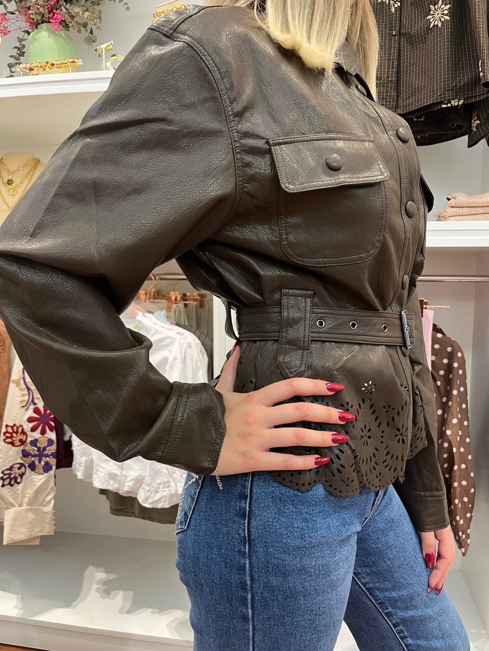 Chaqueta de efecto piel en color marrón chocolate, con cierre de botones y bolsillos delanteros. Incluye cinturón del mismo material para ajustar la cintura y realzar la silueta. El bajo presenta un precioso acabado troquelado con diseño floral que aporta un toque femenino y original.