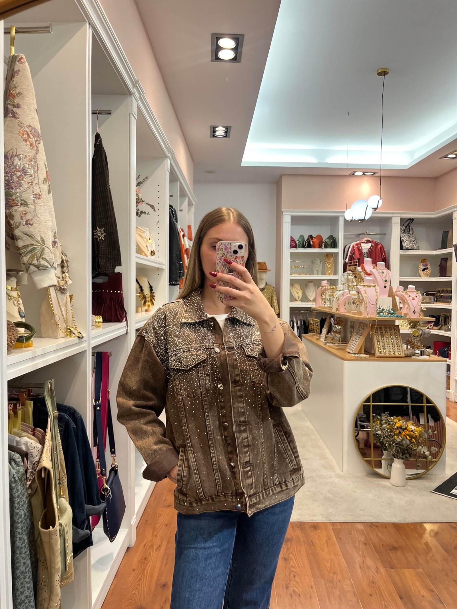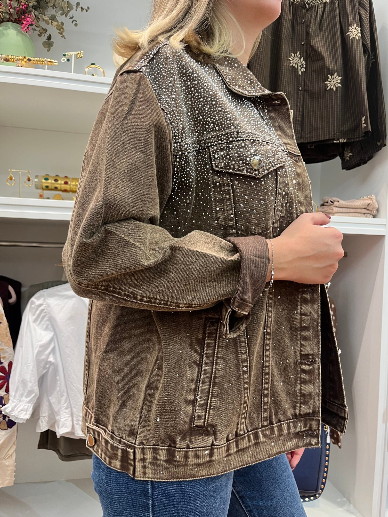 Chaqueta vaquera en tono marrón desgastado, con aplicaciones de strass brillante en la parte superior y hombros.
