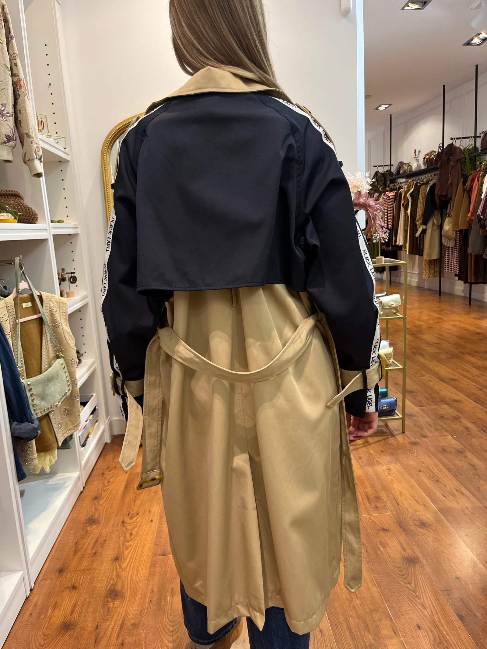 Gabardina midi con diseño bicolor en beige y negro. Cierre cruzado con botones, bolsillos laterales y detalle de cintas en las mangas que le dan un toque moderno y deportivo. Ligera, cómoda y perfecta para el entretiempo. Combínala con vaqueros o vestidos para un look casual con estilo.