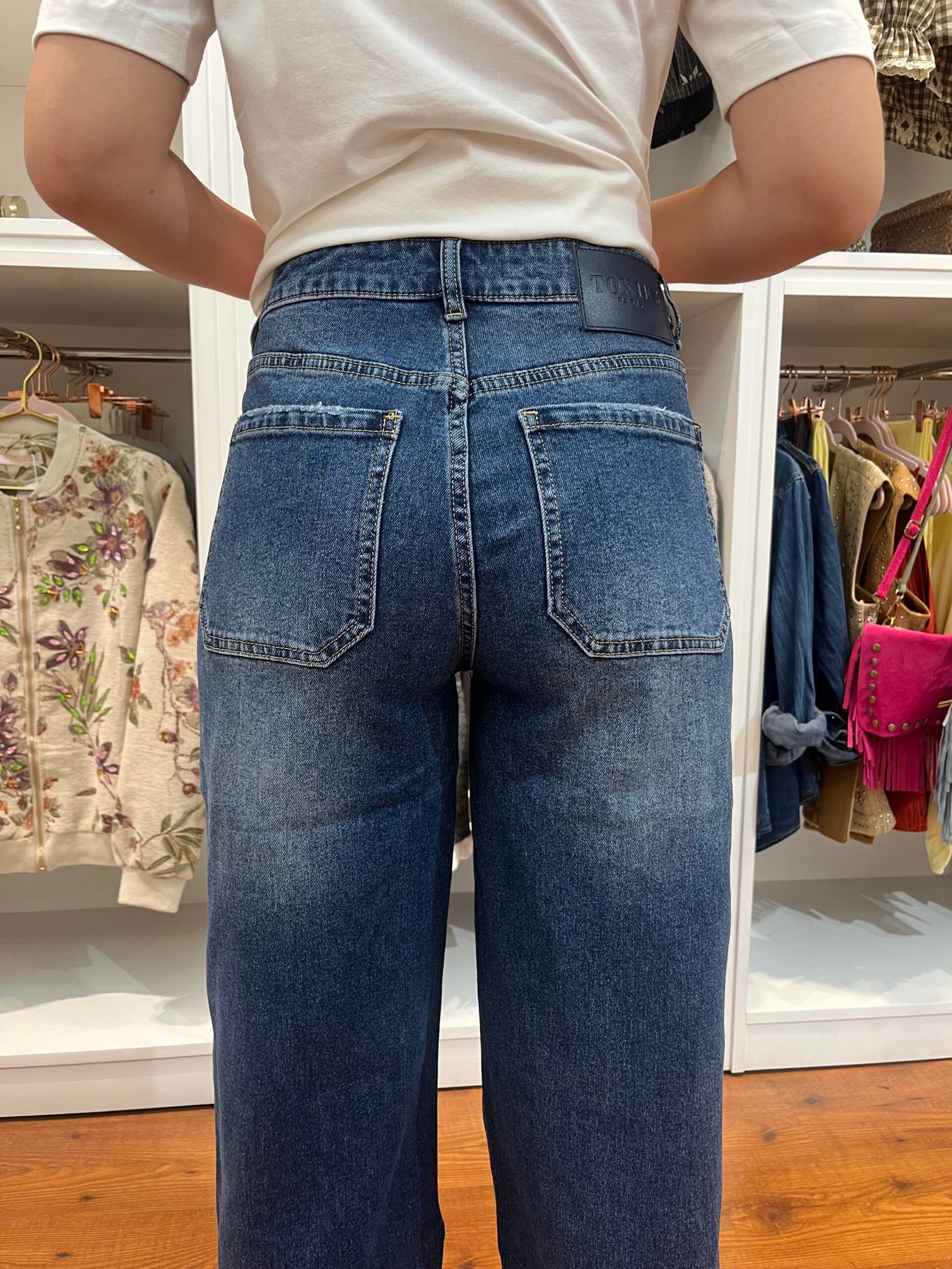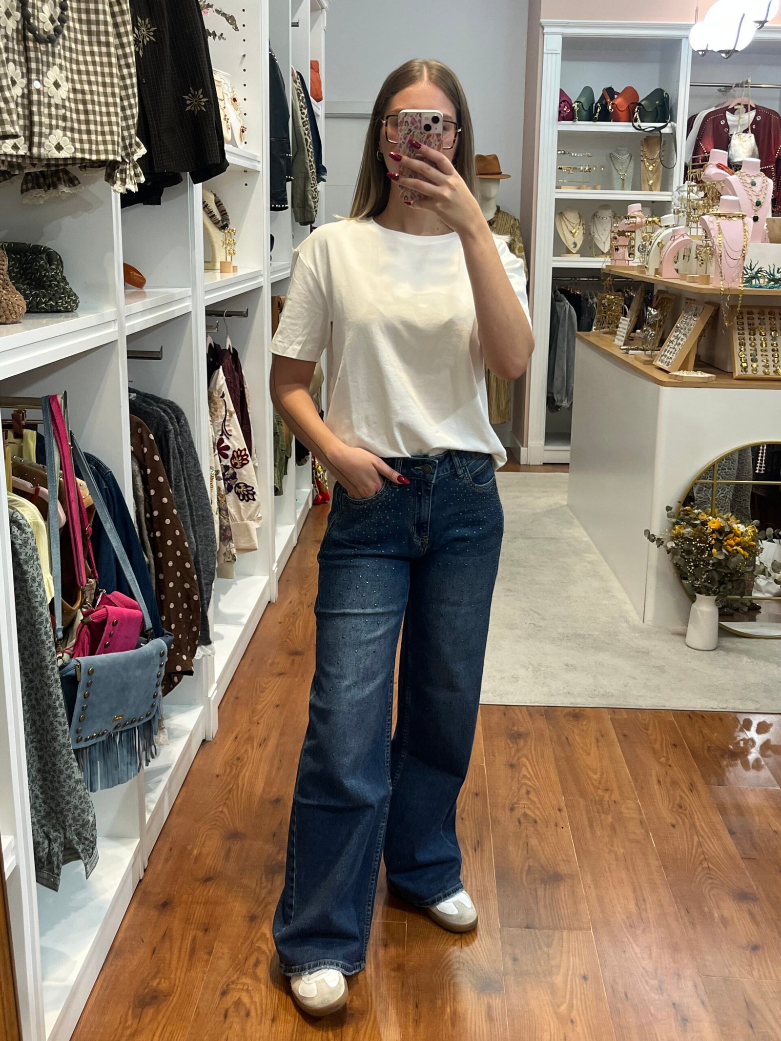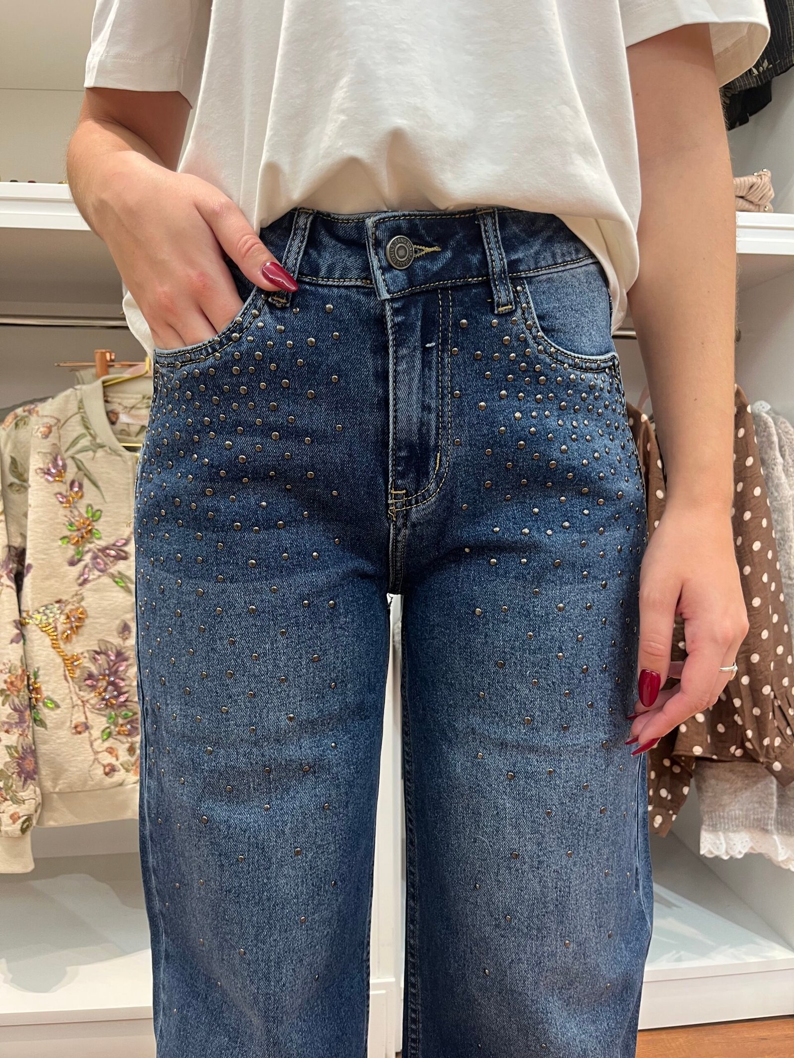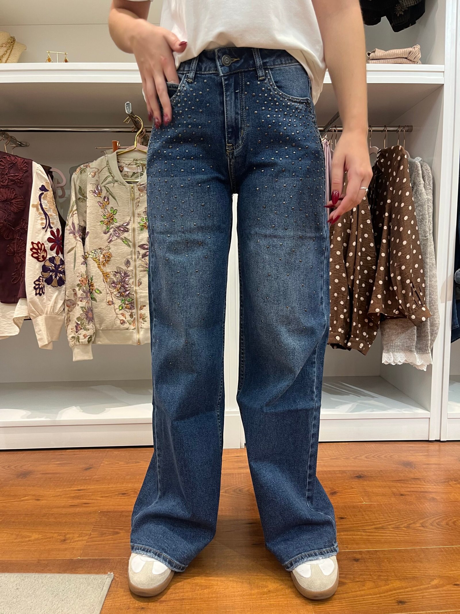 Vaquero ancho con aplicaciones metálicas que aportan brillo y un toque sofisticado. Ideal para elevar cualquier look sin perder comodidad.
