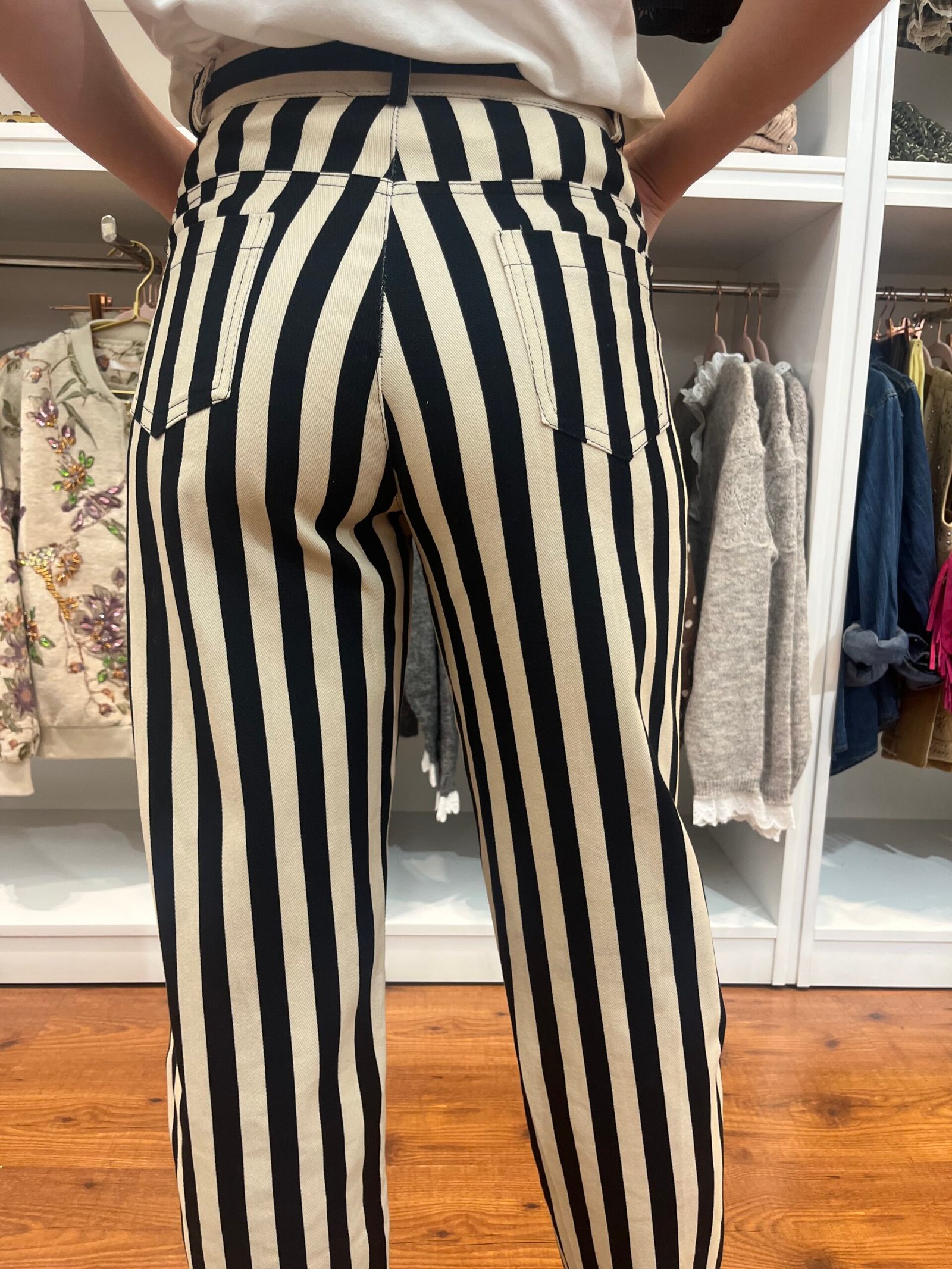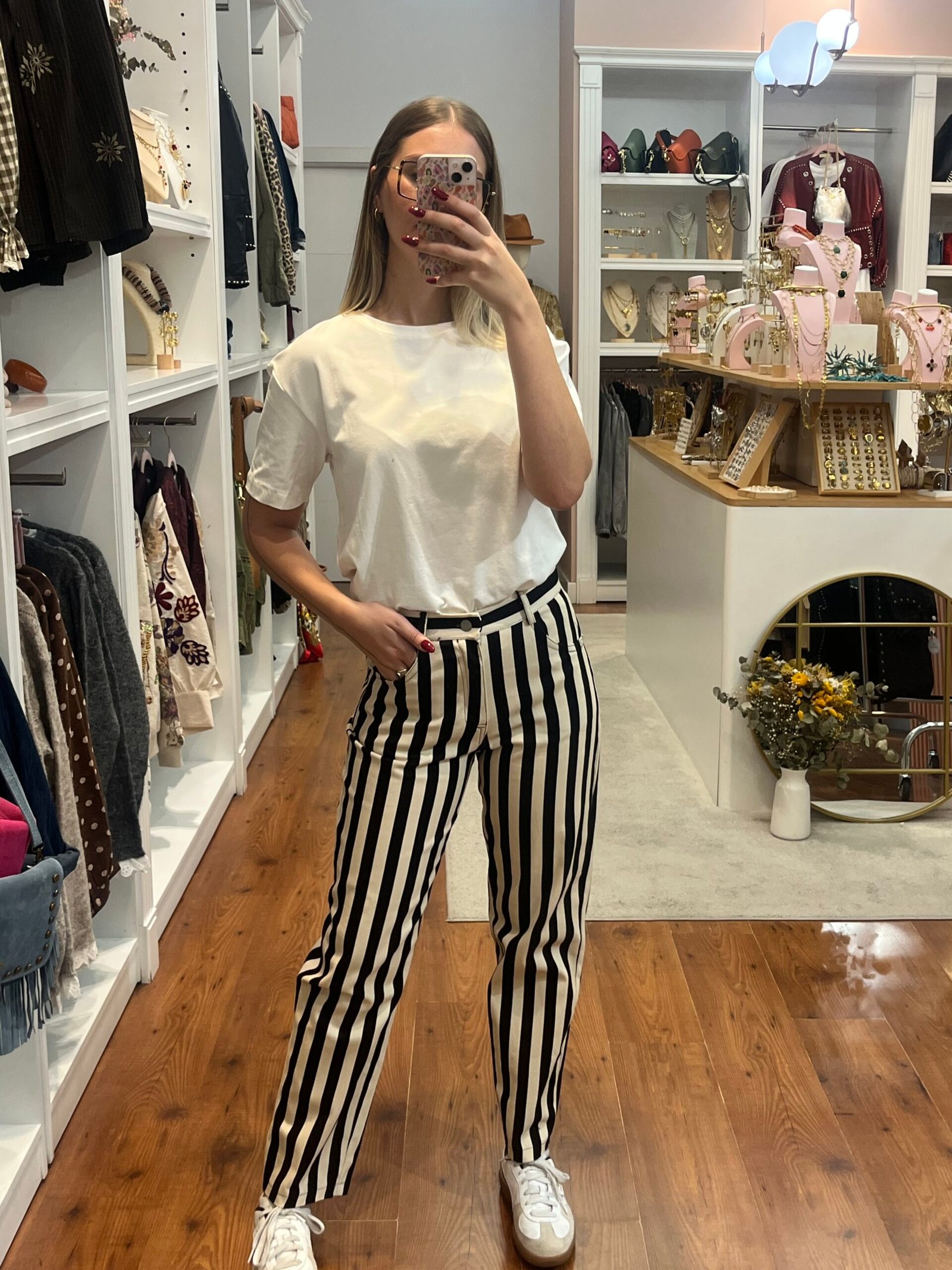 Pantalón de rayas verticales en blanco y negro, ideal para crear looks con fuerza y estilo. Su corte recto estiliza la silueta y aporta un toque rompedor, fácil de combinar tanto con básicos como con prendas más sofisticadas.