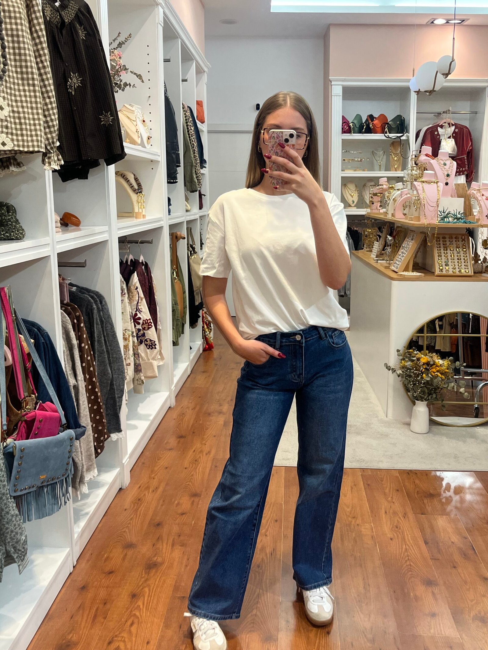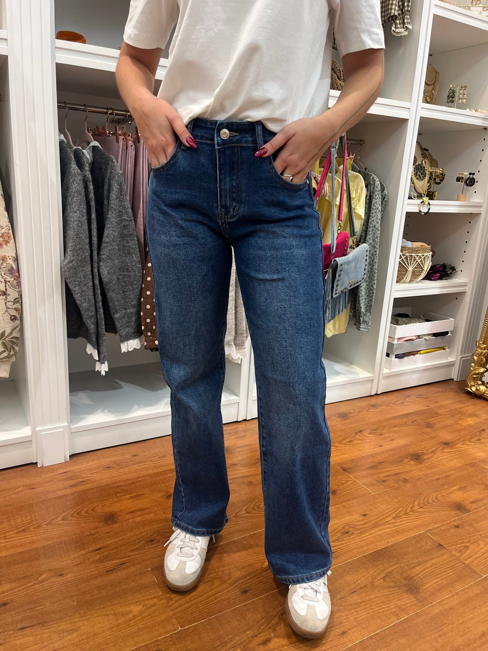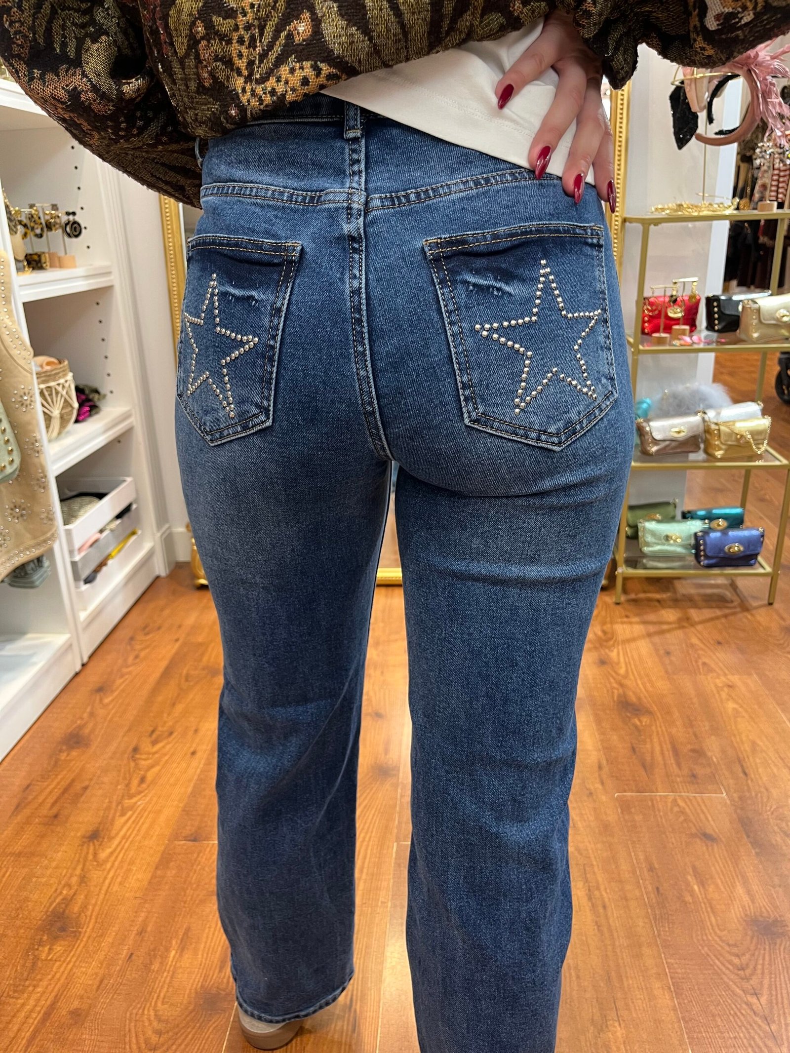Vaquero azul con corte recto y detalle de estrellas con brillantes en los bolsillos traseros. Un diseño que combina el estilo clásico con un toque original y muy favorecedor.